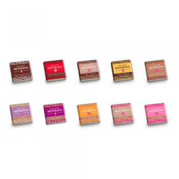 Assortiment de carrés de chocolat : Noir 70% cacao minimum, Noir Fèves de cacao, Noir Nougat, Noir Céréales, Lait 33% de cacao, Lait Praliné, Lait Céréales, Lait Cappuccino, Lait Nougat et Lait Caramel.